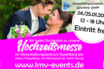 Am 24.01.2026 eröffnet unsere Hochzeitsmesse im Veranstaltungszentrum Gysenberg! Über zwei Tage hinweg erwarten euch viele Aussteller rund um das Thema Hochzeit. Ob Brautmode, Trauringe oder Locations – hier findet ihr alles, was ihr für euren großen Tag braucht. Außerdem findet Ihr auch Hochzeitsfloristik, Brautfrisuren, Make-Up, Hochzeitsfotografie, Hochzeitsmusik, Dekoration, Gastgeschenke, Catering, Weiterlesen